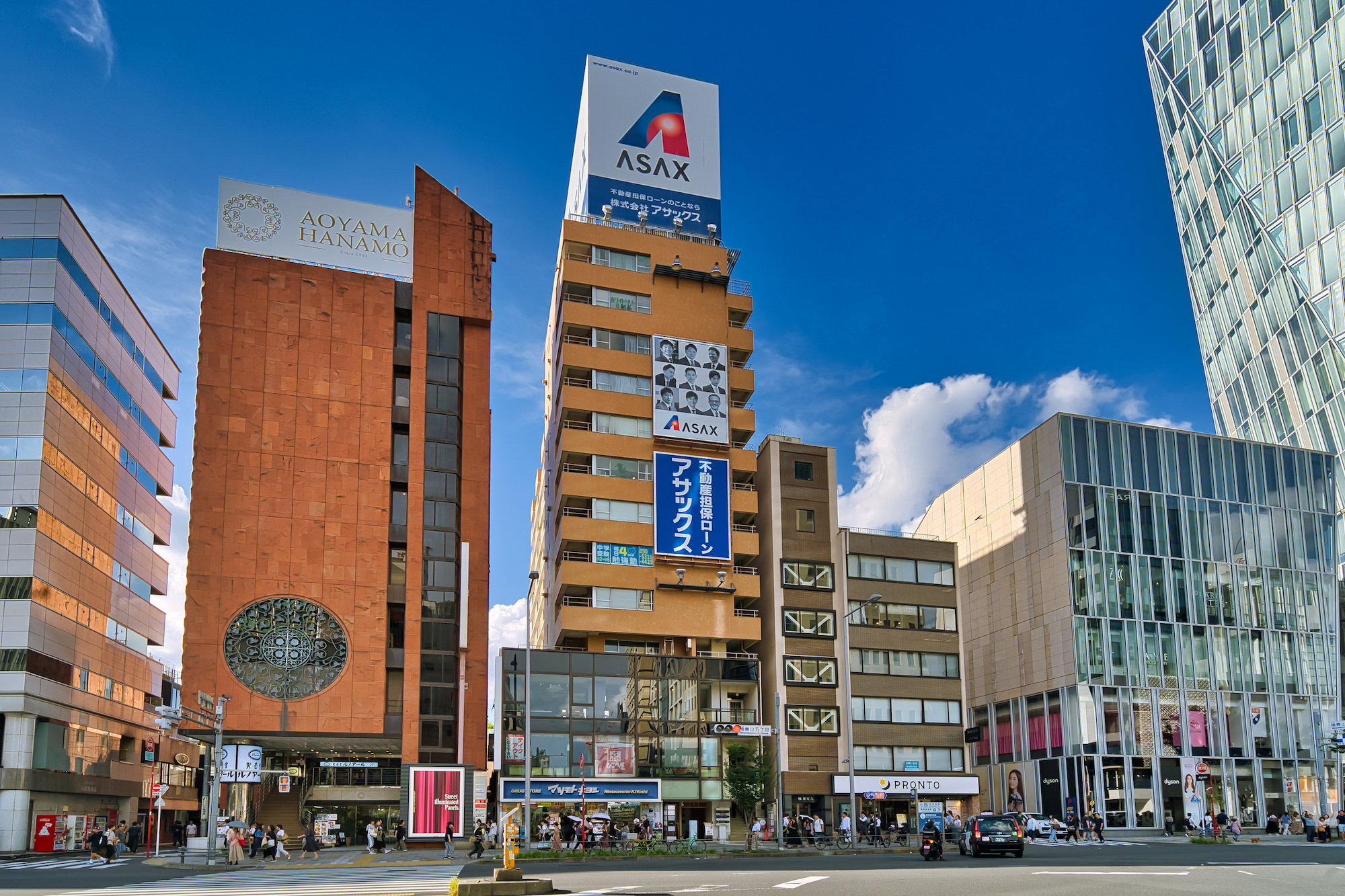 表参道にそびえる斜めの形とガラス張りが特徴的な複合施設です。高層フロアはオフィスフロア。低層フロアは商業施設となります。夜間はLEDでライトアップされています。 -